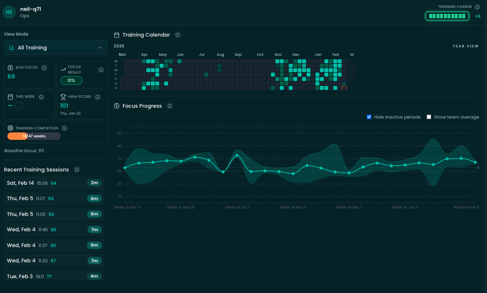 We use commercial EEG headbands and an algorithm—honed over 20 years—to measure focus in real-time. By analyzing specific brainwave frequencies, we turn complex neural activity into a clear, objective metric for cognitive performance.